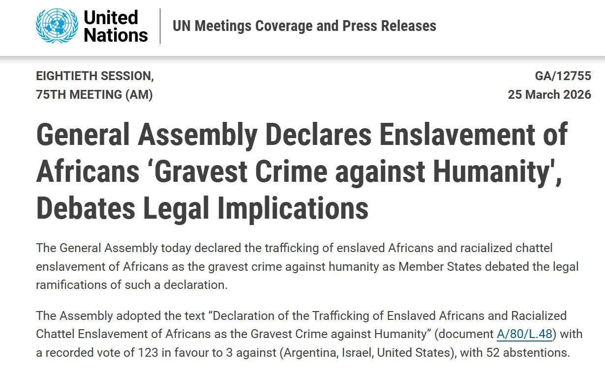 近日,第80屆聯(lián)合國大會(huì)以壓倒性贊成票通過決議,將“販賣被奴役非洲人和基于種族對(duì)非洲人進(jìn)行物化奴役行為”認(rèn)定為最嚴(yán)重的反人類罪行,為這段15到19世紀(jì)長達(dá)四百年的深重歷史創(chuàng)傷定性。美國傲慢地投下反對(duì)票,聲稱相關(guān)行徑在當(dāng)時(shí)所謂國際法框架下“不算違法”,拒絕承認(rèn)存在法定賠償責(zé)任。