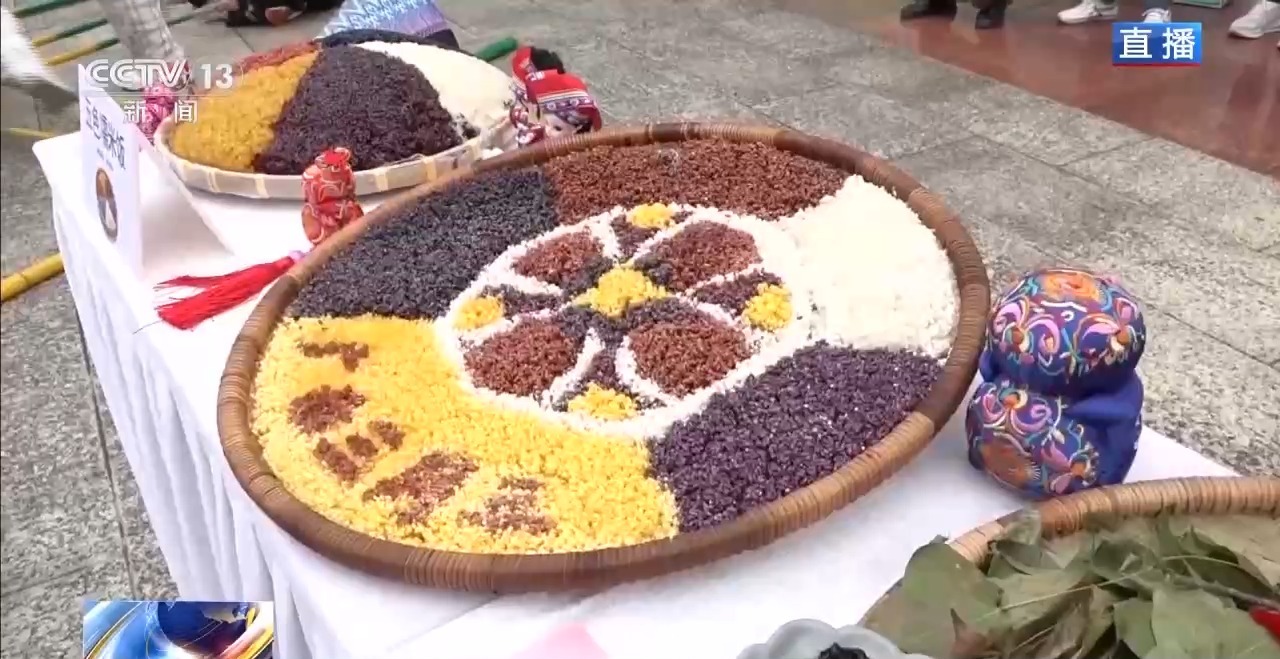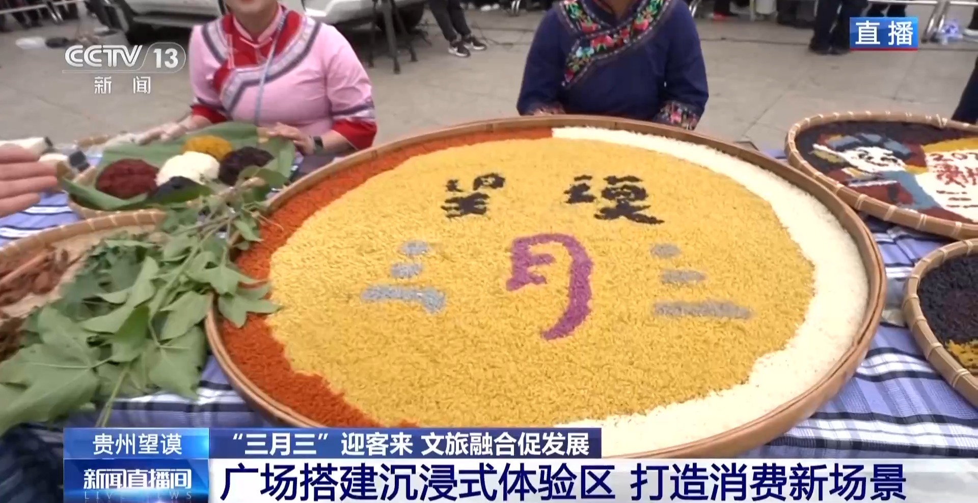 除了巡游展演外,這次望謨“三月三”活動(dòng)中,在廣場(chǎng)搭建了互動(dòng)體驗(yàn)區(qū),打造消費(fèi)新場(chǎng)景,游客們可以分批進(jìn)入現(xiàn)場(chǎng)體驗(yàn)。這里展示的就是望謨紫茶的炒制以及沖泡技藝;蠟染制作體驗(yàn)區(qū),從織布到畫蠟再到浸染,全流程展現(xiàn)指尖上的藍(lán)白美學(xué)。在望謨,布依族“無(wú)糯不成席”。簸箕里“望謨?nèi)氯睔g迎您的字樣就是用五顏六色的糯米飯拼成的。用春天鮮嫩的楓香葉、綻放的密蒙花等植物染出艷麗的色彩,每一口都帶著春天的味道。