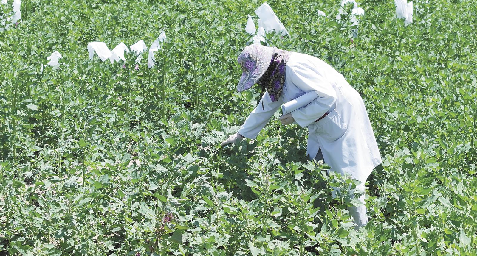 劉洋在田間查看植物長(zhǎng)勢(shì)情況。圖片由植物新品種測(cè)試(西寧)分中心提供