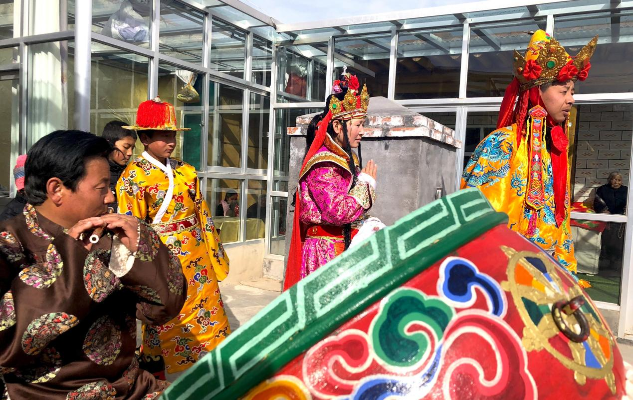 尖藏村村民正在排練藏戲《智美更登》。新華社記者 白瑪央措 攝