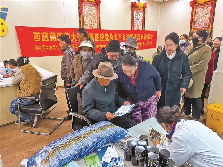 圖為西藏藏醫(yī)藥大學附屬醫(yī)院黨總支在扎細新村社區(qū)藏醫(yī)館開展送醫(yī)送藥義診活動。