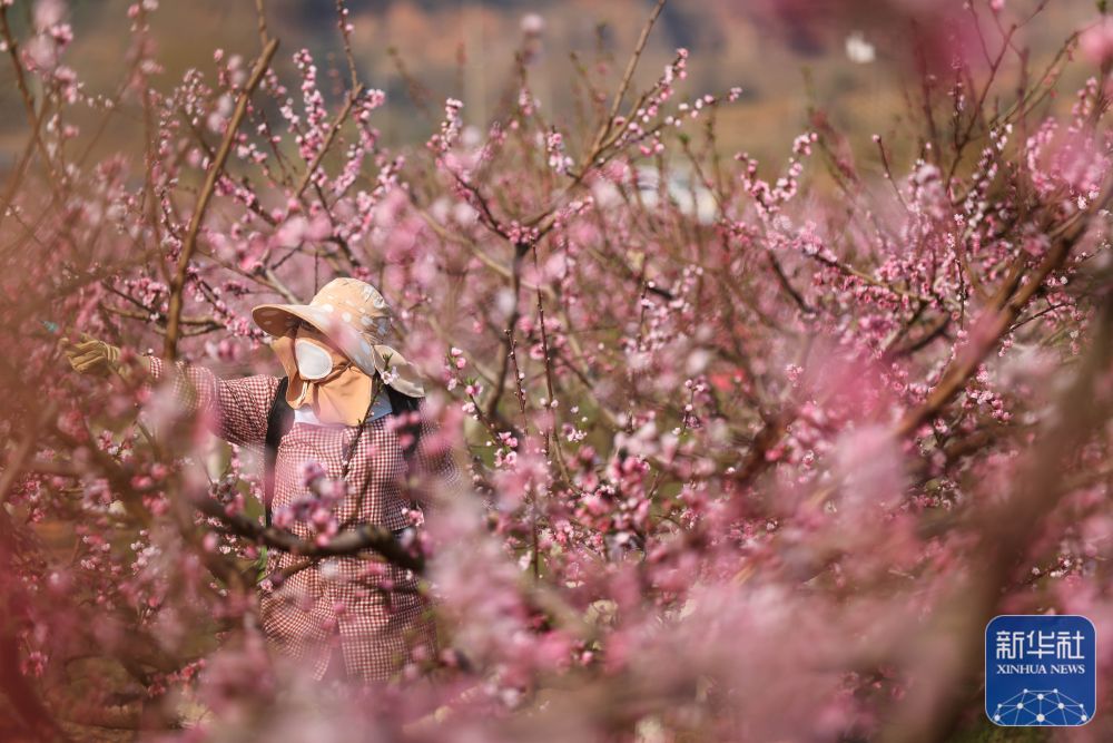 3月17日,在云南省曲靖市沾益區(qū)盤江鎮(zhèn)河西村桃園基地,果農(nóng)在果園進(jìn)行管護(hù)作業(yè)。新華社發(fā)(孫文來(lái)攝)