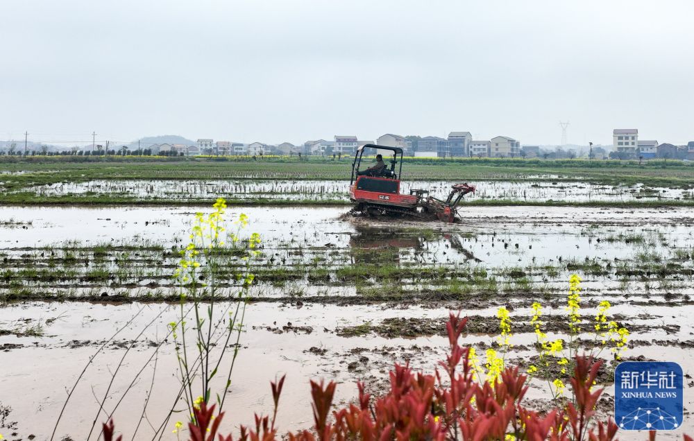 3月17日,在湖南省衡陽(yáng)市衡陽(yáng)縣西渡鎮(zhèn)青里村,村民駕駛農(nóng)機(jī)翻耕農(nóng)田(無(wú)人機(jī)照片)。新華社發(fā)(周秀魚春攝)