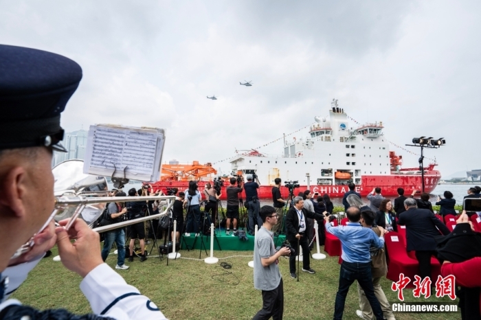這次,香港更是以“海陸空”上陣歡迎“雪龍2”號(hào)到訪香港。在“雪龍2”號(hào)不遠(yuǎn)處,兩艘拖船和一艘消防船在碼頭附近對(duì)射水柱,形成水拱門。香港飛行服務(wù)隊(duì)的直升機(jī)飛過(guò)維多利亞港上空示意致敬,香港警察銀樂(lè)隊(duì)在現(xiàn)場(chǎng)奏樂(lè),九龍巴士車隊(duì)貼上歡迎“雪龍2”號(hào)標(biāo)志,還有舞獅隊(duì)歡迎“雪龍2”號(hào)來(lái)到香港。