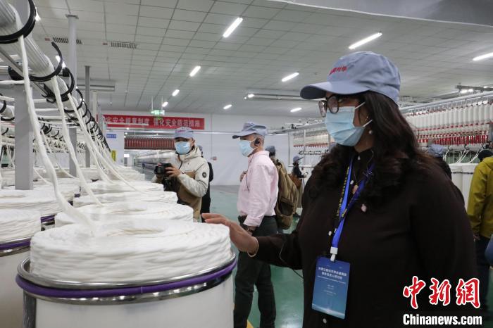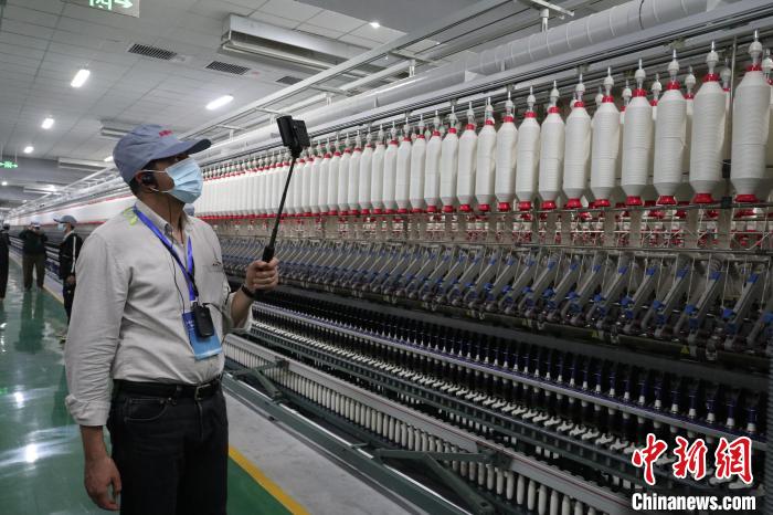 4月13日,外國(guó)媒體人參觀(guān)拍攝新疆尉犁縣利華紡織有限公司紡紗廠(chǎng)工作情況。 徐雪瑩 攝
