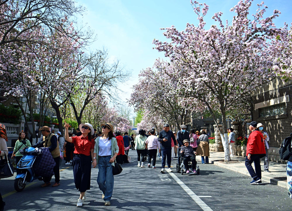 游客在海棠花盛開的五大道大理道上漫步休閑(4月7日攝)。