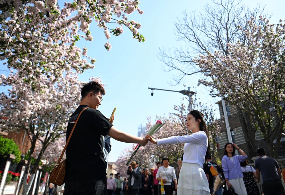 市民在海棠花盛開的五大道大理道上拍照打卡(4月7日攝)。