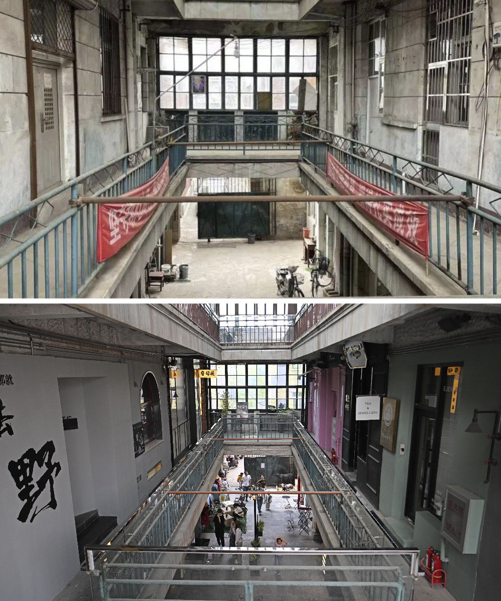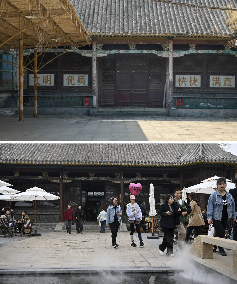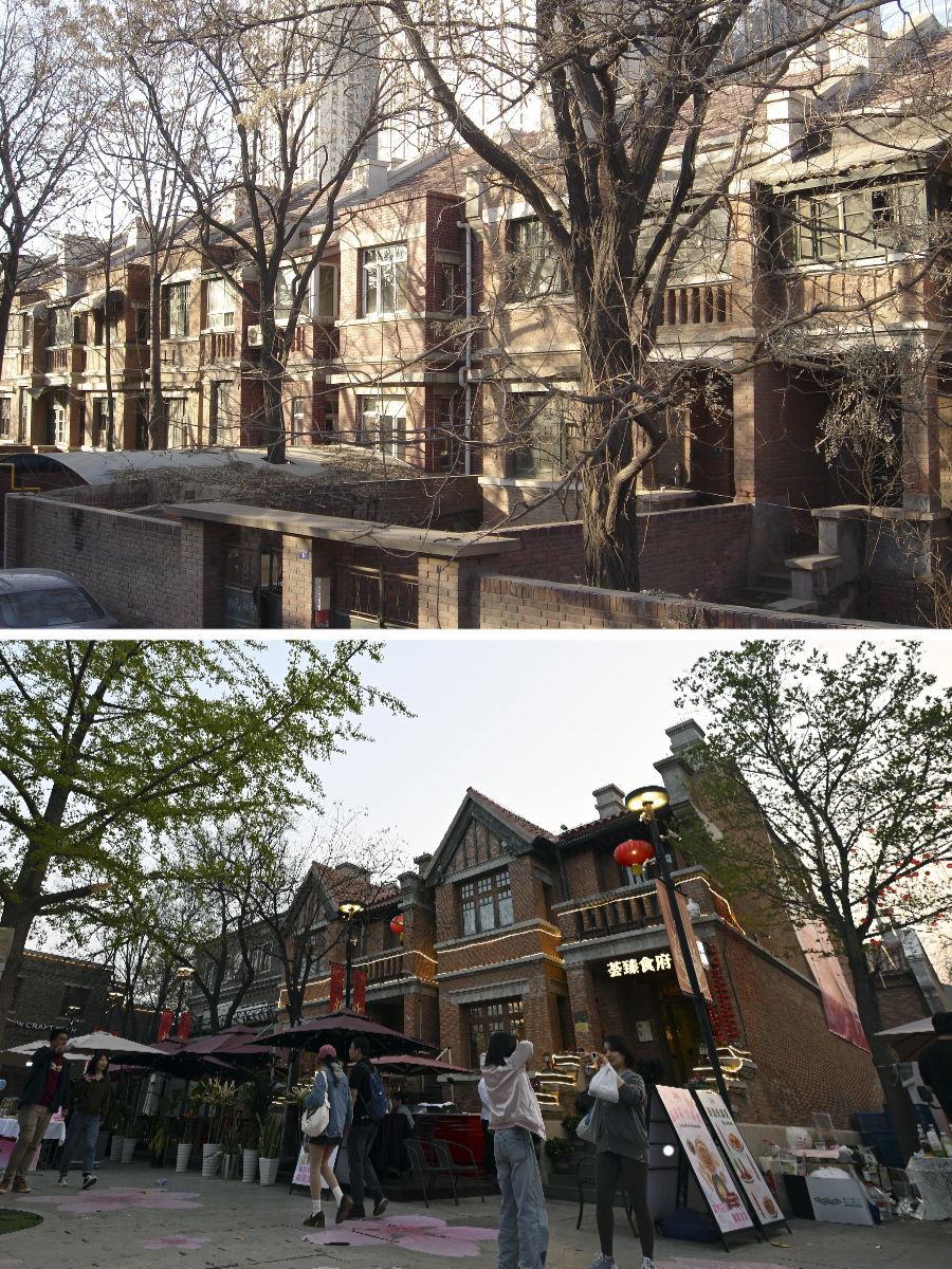 拼版照片:上圖是改造前的先農(nóng)大院(資料照片)。下圖是游客在位于五大道的先農(nóng)大院內(nèi)游覽(4月6日攝)。始建于1925年的先農(nóng)大院是五大道建成最早的建筑群之一,融合了英式聯(lián)排住宅、英式獨棟別墅等多種特色的建筑風(fēng)格。歲月變遷,這些建筑一度損壞嚴(yán)重,配套設(shè)施老化。2006年起,天津啟動先農(nóng)大院整理項目,對街區(qū)居民進(jìn)行了騰遷,對建筑進(jìn)行了加固修繕,恢復(fù)了街區(qū)的歷史原貌,引進(jìn)了餐飲、文化展示、辦公等業(yè)態(tài),使這里形成了環(huán)境優(yōu)雅的公共藝術(shù)和展示建筑遺產(chǎn)的城市新空間。