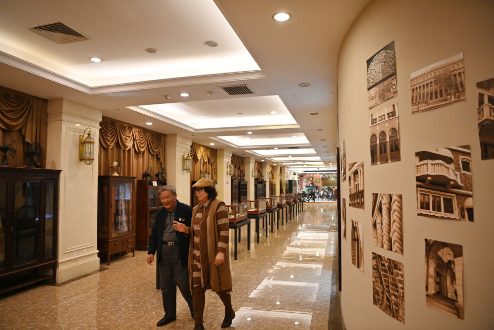 在五大道歷史博物館,金彭育(左)和館長劉春芬互相交流(4月13日攝)。