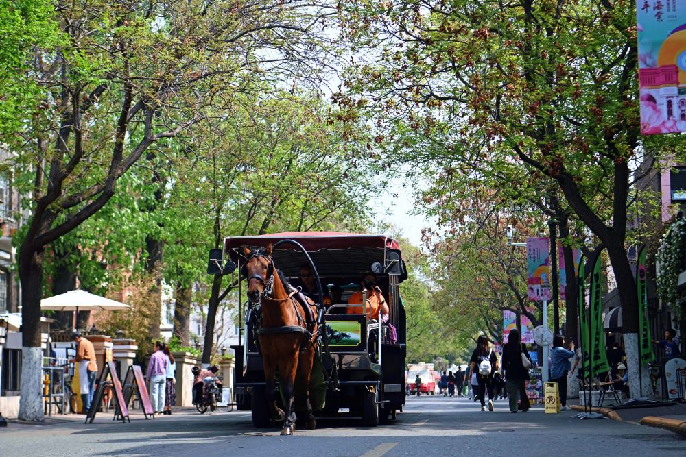 一輛載著游客的觀光馬車行駛在五大道街區(qū)(4月13日攝)。