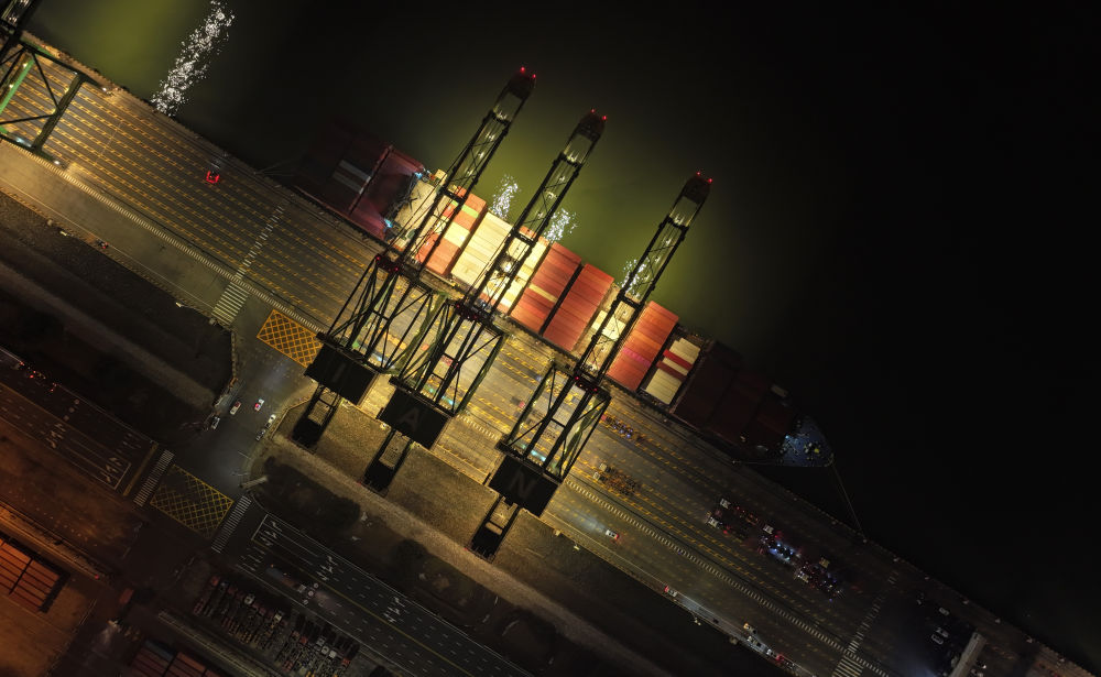 2024年1月16日,大型集裝箱班輪“巴赫”號(hào)靠泊在天津港太平洋國(guó)際集裝箱碼頭(無(wú)人機(jī)照片)。新華社記者 趙子碩 攝