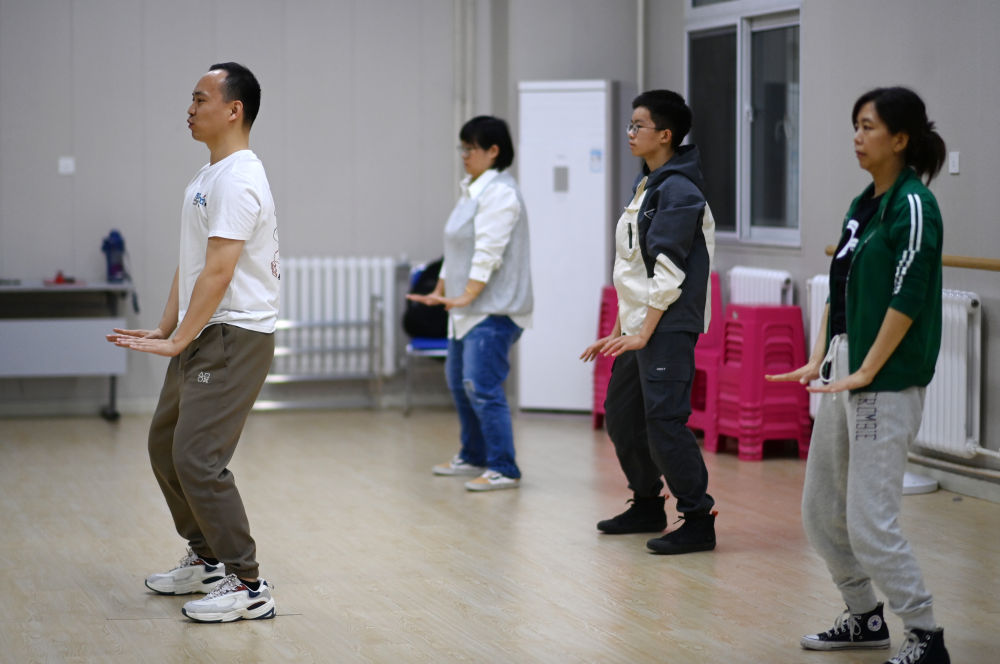 ↑4月26日,在天津青年宮,青年夜校教師鞠磊(左一)指導(dǎo)學(xué)員練習(xí)八段錦。