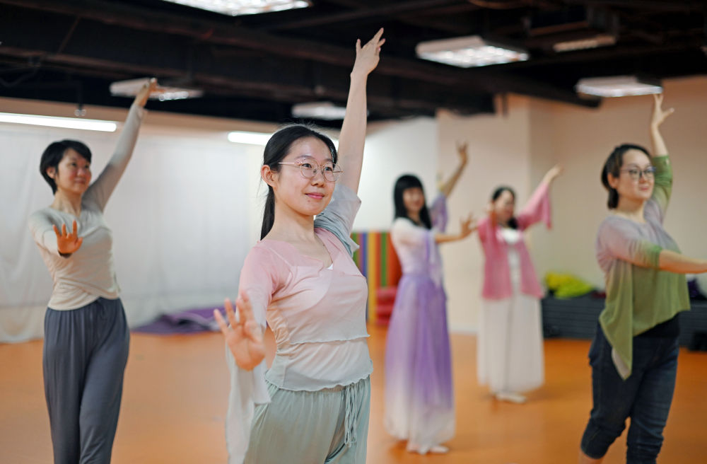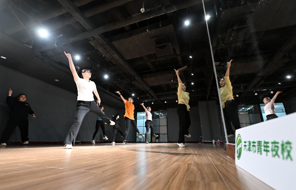 ↑4月26日,在天津青年宮,學(xué)員在青年夜校民族舞課上練習(xí)。