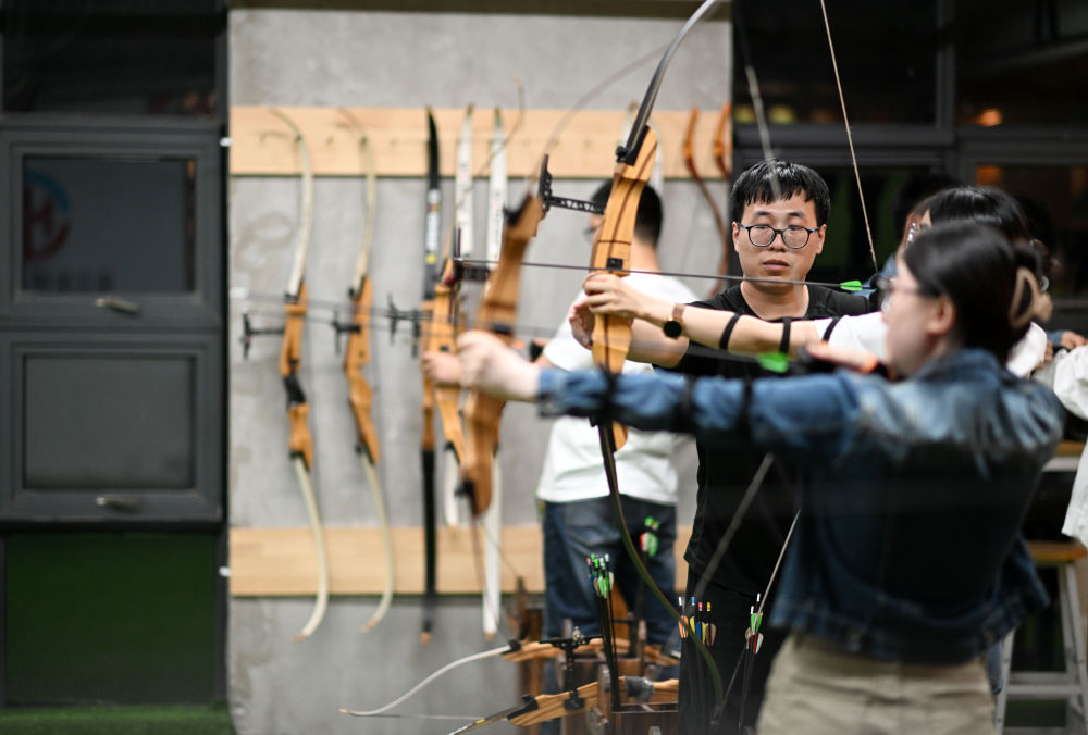 ↑4月25日,在天津市璽元銳鋒射箭俱樂部,學(xué)員在河西區(qū)青年夜校射箭課上體驗(yàn)射箭運(yùn)動(dòng)。