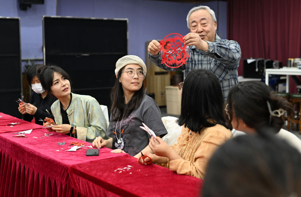 ↑4月24日,在天津市河西區(qū)春秋文化藝術(shù)中心,河西區(qū)青年夜校教師在剪紙?bào)w驗(yàn)課上展示學(xué)員作品。