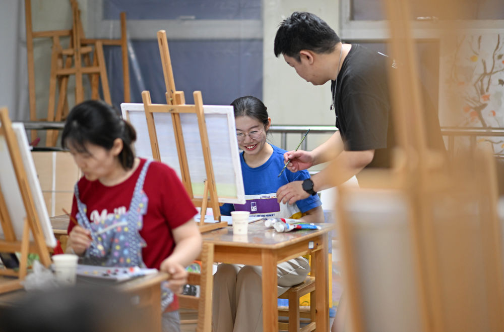 ↑4月26日,在天津青年宮,青年夜校教師陸圣指導(dǎo)學(xué)員呂昕蕾學(xué)習(xí)油畫。