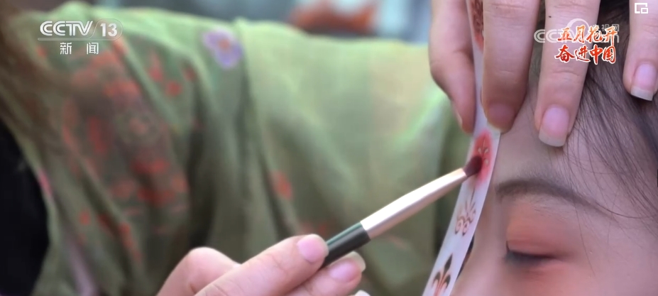 花鈿是古代女性在額頭部位點(diǎn)綴的一種花飾?,F(xiàn)在的胡芯銀,不僅會(huì)根據(jù)顧客的年齡、臉型和服裝的樣式來搭配不同風(fēng)格的花鈿,還會(huì)給小姐姐們做一些傳統(tǒng)文化的講解。胡芯銀說,要想做得更好,就要多看多學(xué)。