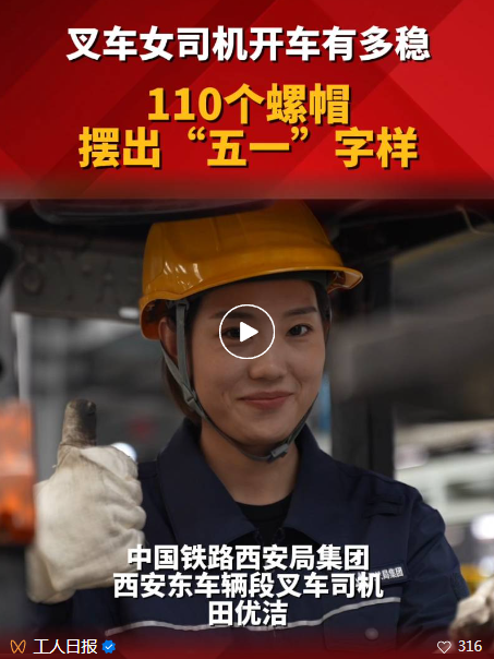 “95后”姑娘田優(yōu)潔是中國鐵路西安局集團(tuán)有限公司西安東車輛段的一名叉車司機(jī),平時的主要工作就是駕駛叉車完成車鉤的裝卸作業(yè)?!拔逡弧眹H勞動節(jié)之際,田優(yōu)潔開著叉車用110個螺帽擺出了“五一”字樣,這技術(shù),真的穩(wěn)!