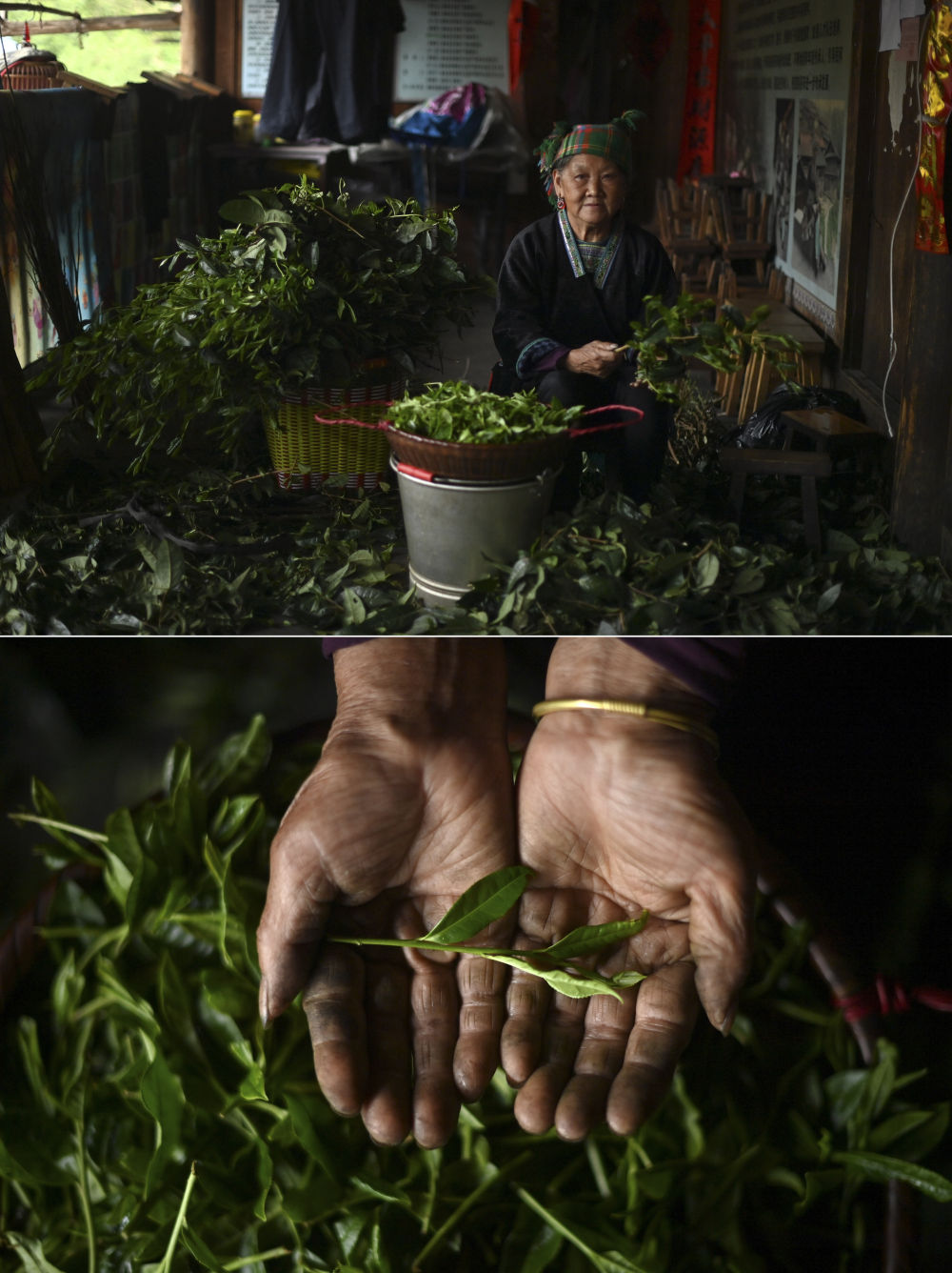 在廣西柳州市融水苗族自治縣桿洞鄉(xiāng)黨鳩村,72歲的梁妹花老人在整理剛剛采摘的茶葉(4月11日攝)。油茶是當?shù)氐膫鹘y(tǒng)飲品,梁妹花每天都要打油茶。