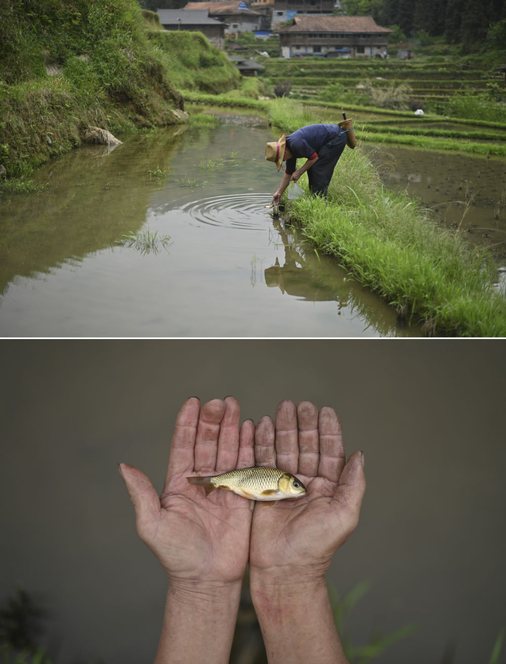 在廣西柳州市融水苗族自治縣桿洞鄉(xiāng)黨鳩村,67歲的吳慶輝在稻田里放魚苗(4月11日攝)。在稻田里養(yǎng)殖禾花魚是當?shù)氐膫鹘y(tǒng),可以提高稻田利用率,增加收入。