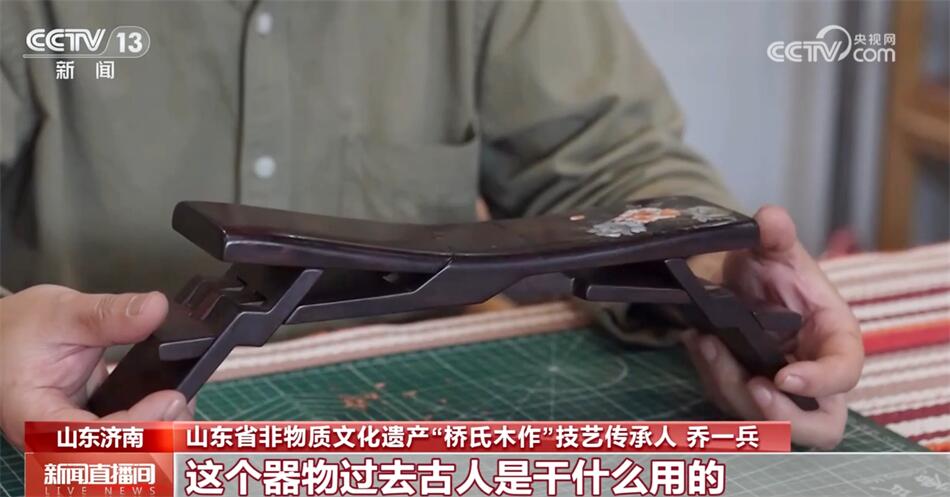 山東省非物質(zhì)文化遺產(chǎn)“橋氏木作”技藝傳承人喬一兵介紹:“它本身是一整塊木頭六個面,通過鋸和鑿形成一個器物。這個器物過去古人是干什么用的?當枕頭用的,也可以當?shù)首佑?,它最大的特點是可以折疊,攜帶非常方便,傳說是魯班發(fā)明的。和眾多的優(yōu)秀的傳統(tǒng)技藝一樣,它深層次代表的是中國的一些思想、一些哲學、一些文化在里邊,魯班枕的核心是平衡和和諧,我覺得我很有必要把它傳承下來,發(fā)揚光大。”