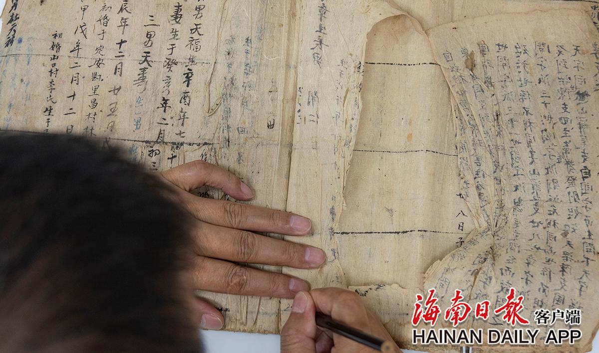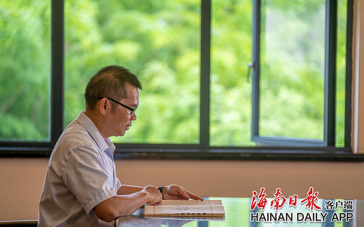 黃文鋒在查看古籍紙張破損情況。海南日?qǐng)?bào)記者袁琛 攝