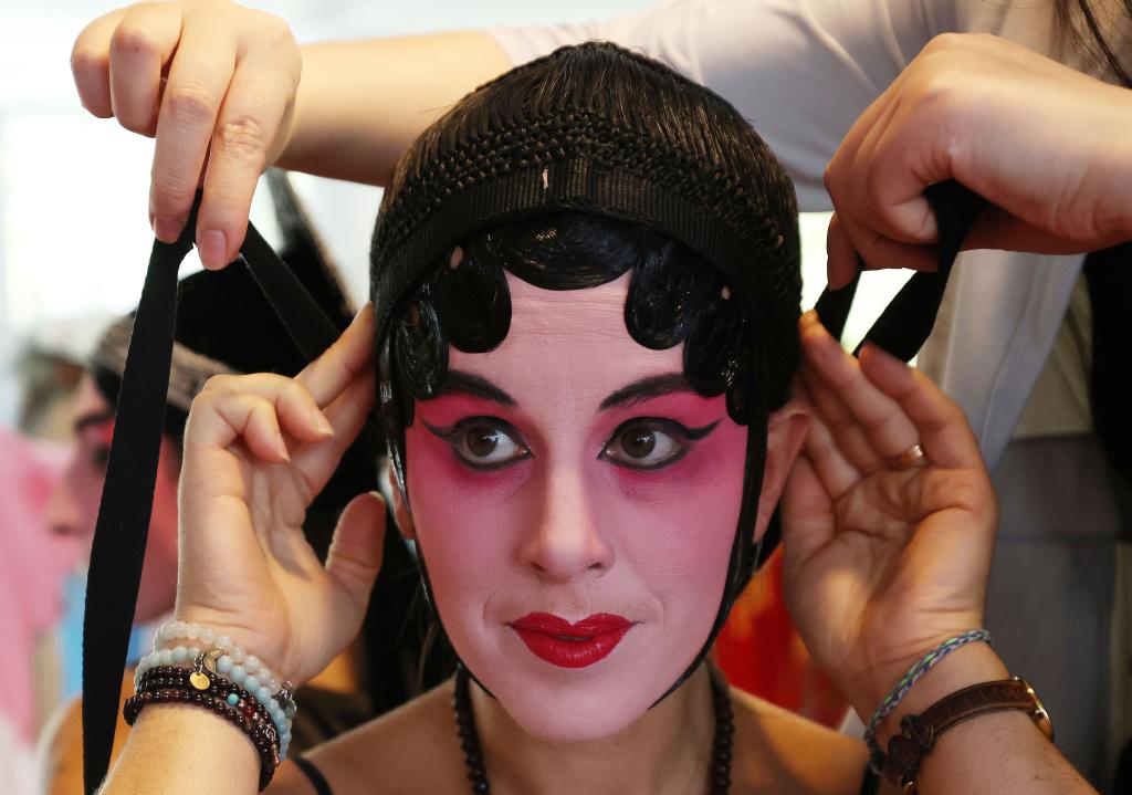 2023年9月9日,在法國巴黎中國文化中心,法國觀眾體驗(yàn)昆曲旦角扮相。新華社記者高靜 攝