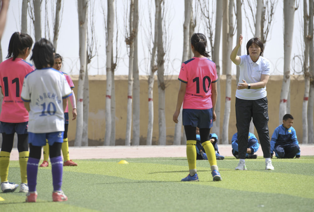 中國(guó)女足前主教練水慶霞帶孩子們一起訓(xùn)練。
