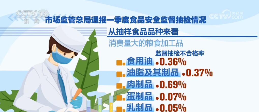 從抽樣食品品種來(lái)看,消費(fèi)量大的糧食加工品,食用油、油脂及其制品,肉制品,蛋制品,乳制品等5大類(lèi)食品,監(jiān)督抽檢不合格率分別為0.36%、0.37%、0.69%、0.07%、0.05%,均低于總體抽檢不合格率。與上年同期相比,餐飲食品、冷凍飲品等14大類(lèi)食品抽檢不合格率有所降低,但特殊膳食食品、調(diào)味品等18大類(lèi)食品抽檢不合格率有所上升。 從檢出的不合格項(xiàng)目類(lèi)別看,一些不合格項(xiàng)目占抽檢不合格樣品總量為農(nóng)藥殘留超標(biāo)46.45%,超范圍超限量使用食品添加劑16.29%,微生物污染11.75%,有機(jī)物污染問(wèn)題8.78%,獸藥殘留超標(biāo)6.35%,質(zhì)量指標(biāo)不達(dá)標(biāo)5.53%,重金屬等污染3.50%。