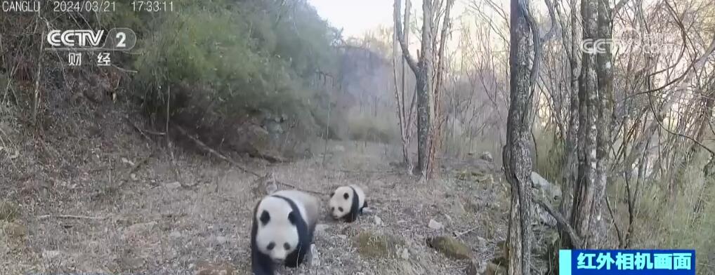 這段視頻拍攝于海拔約2000米處,大熊貓媽媽身形健壯,步伐從容地走在前面,幼崽嬌小可愛,緊緊跟在媽媽的身后。十幾分鐘后,這對“母子”的身影再次出現在同一條溝的另一個點位。