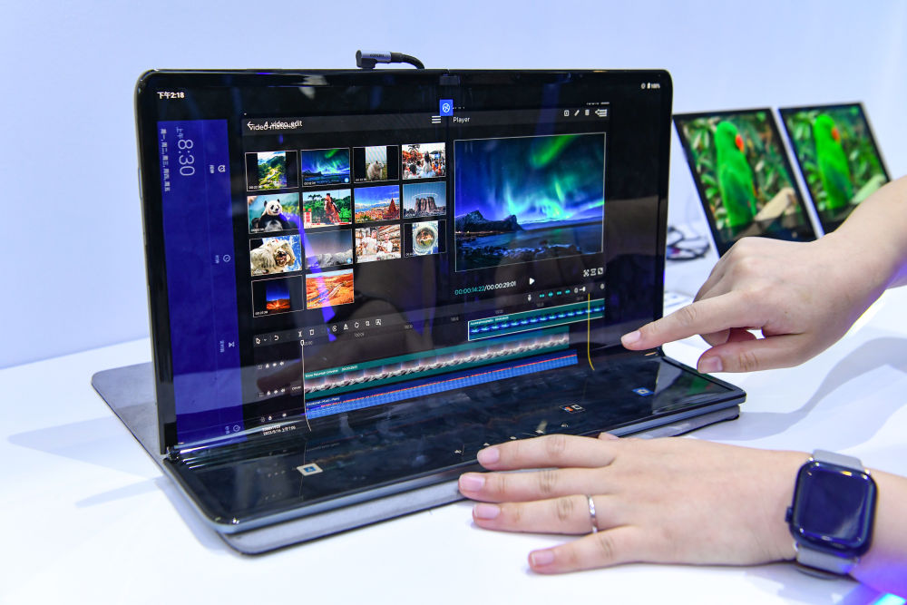 在“2023世界顯示產(chǎn)業(yè)大會(huì)新型顯示創(chuàng)新成果展”現(xiàn)場,工作人員展示京東方折疊顯示屏。新華社記者唐文豪 攝