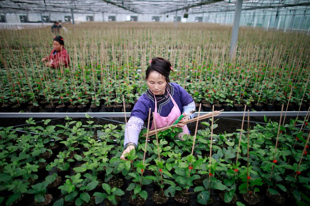 在貴州省榕江縣車江壩區(qū)智慧育苗中心內(nèi),一名少數(shù)民族婦女在大棚內(nèi)對(duì)百香果苗進(jìn)行管理(2023年2月28日攝)。新華社記者 劉續(xù) 攝