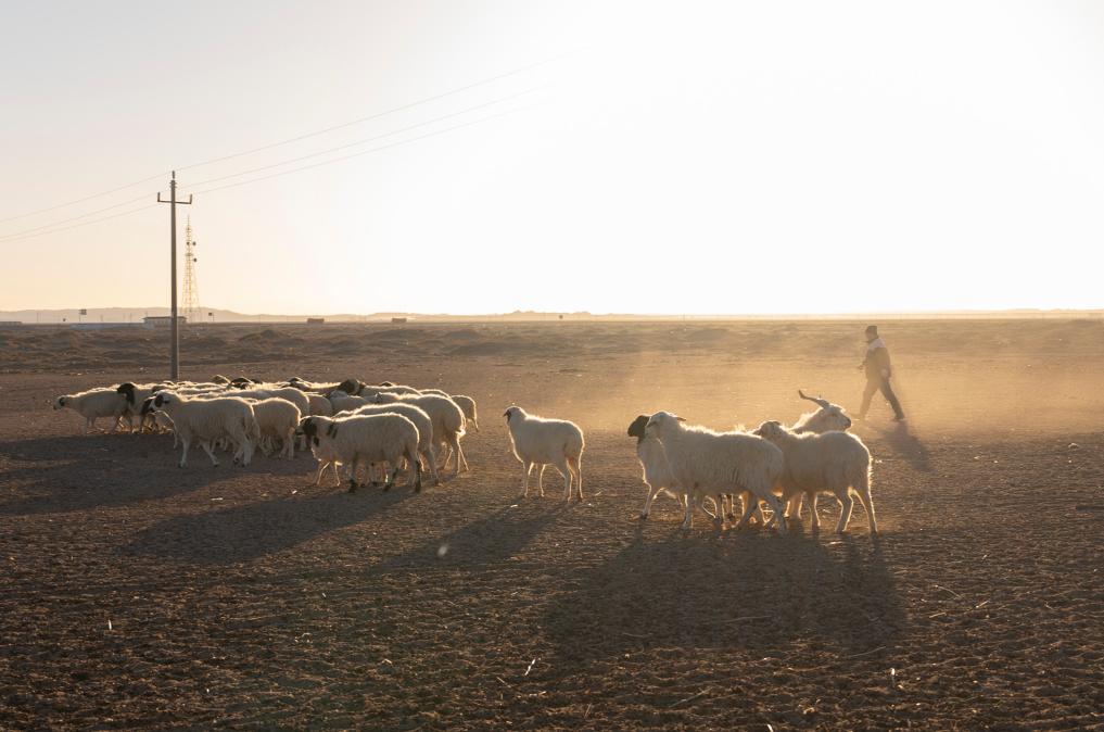 在內(nèi)蒙古阿拉善左旗烏力吉蘇木溫都爾毛道嘎查,牧民朝勒門格爾勒在晨光中放羊(2023年11月17日攝)。新華社記者 才揚(yáng) 攝