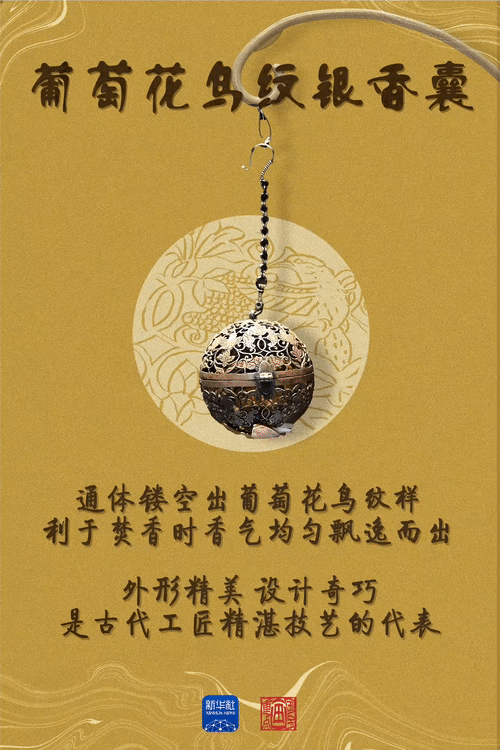 葡萄花鳥(niǎo)紋銀香囊體現(xiàn)了唐代貴族的生活意趣。“唐代社會(huì)的開(kāi)放包容,人們生活中的儀式感都融入在這枚香囊之中?!标兾鳉v史博物館副研究館員賀達(dá)炘說(shuō)。