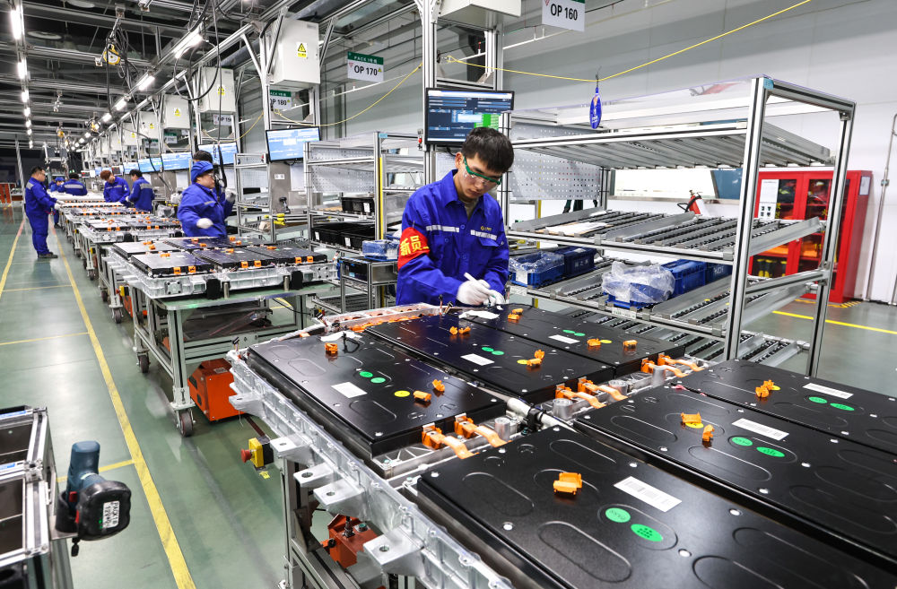 在上汽時代動力電池系統(tǒng)有限公司車間,工人在安裝新能源汽車動力電池系統(tǒng)(2023年2月16日攝)。