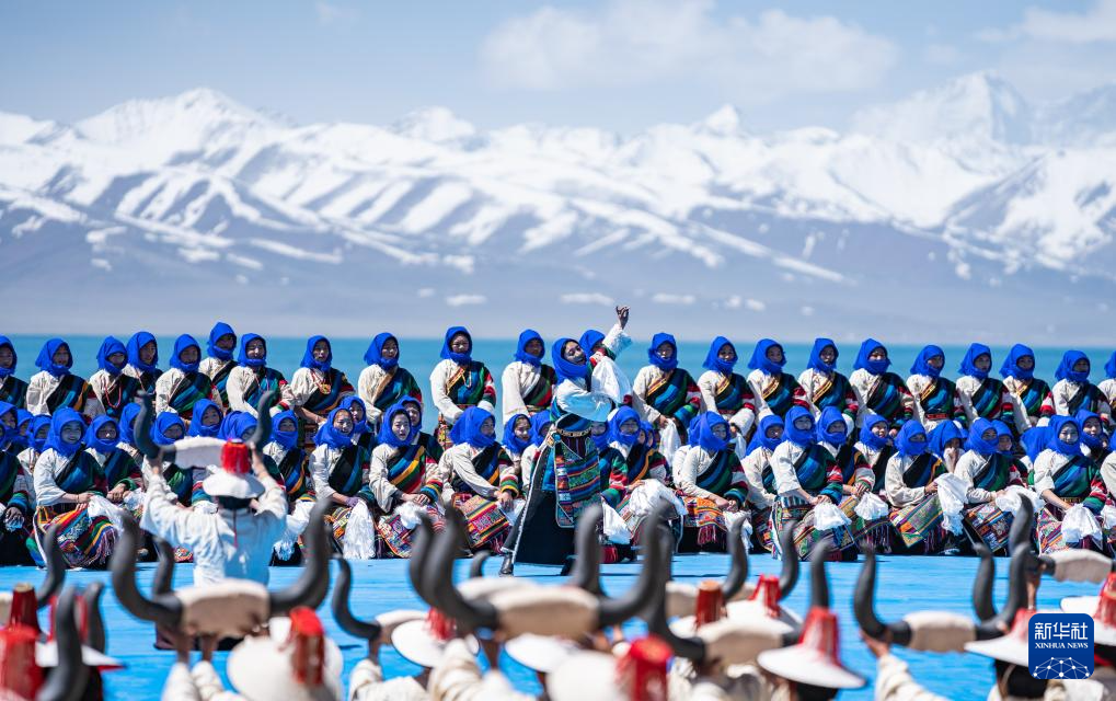 舞蹈演員在納木錯(cuò)開(kāi)湖活動(dòng)現(xiàn)場(chǎng)表演(5月19日攝)。