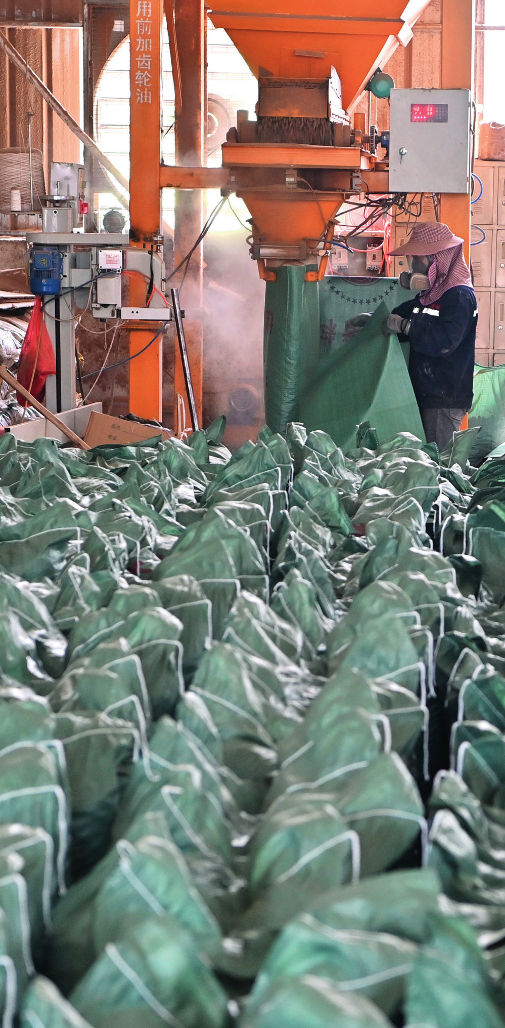工作人員在廣西來賓小平陽鎮(zhèn)一家飼料廠將甘蔗葉為主要原料的飼料裝袋(2023年12月12日攝)周華攝
