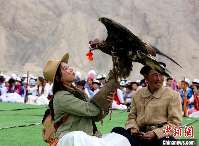 近日,2024年新疆阿合奇縣獵鷹文化旅游季拉開帷幕,游客現(xiàn)場與獵鷹互動(dòng)。陶拴科 攝