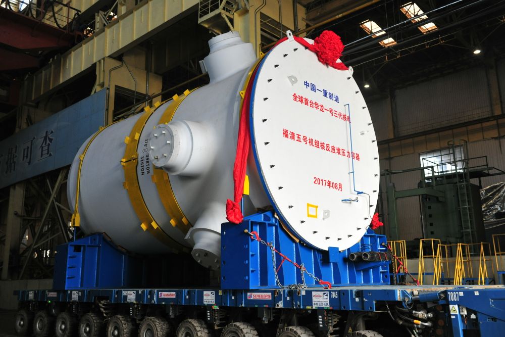 2017年8月,全球首臺(tái)“華龍一號(hào)”三代核電——福清五號(hào)機(jī)組反應(yīng)堆壓力容器準(zhǔn)備進(jìn)行吊裝(資料照片)。