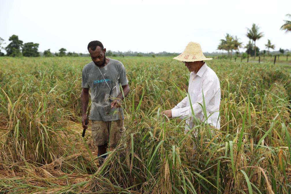 3月13日,在太平洋島國斐濟(jì)瑙索里鎮(zhèn),中國專家(右)在中國援斐濟(jì)農(nóng)業(yè)發(fā)展技術(shù)水稻項(xiàng)目試驗(yàn)示范培訓(xùn)基地查看暴雨過后水稻倒伏情況。新華社發(fā)(桑欽龍攝)
