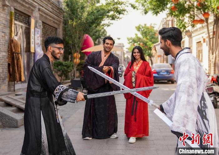 圖為邯森等4名巴基斯坦留學(xué)生在回車(chē)巷歷史文化街區(qū)穿漢服,感受中國(guó)傳統(tǒng)文化。王倩倩 攝