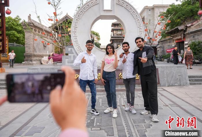 圖為邯森等4名巴基斯坦留學(xué)生在回車(chē)巷歷史文化街區(qū)拍照留念。王倩倩攝
