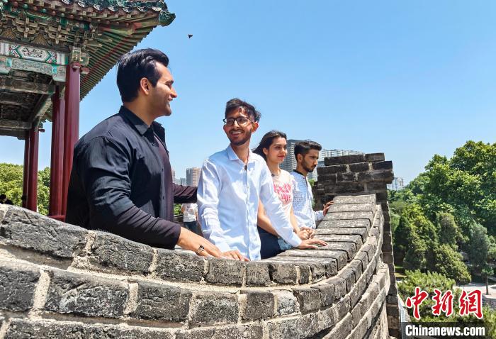 圖為邯森等4名巴基斯坦留學(xué)生登上叢臺(tái)。王倩倩攝