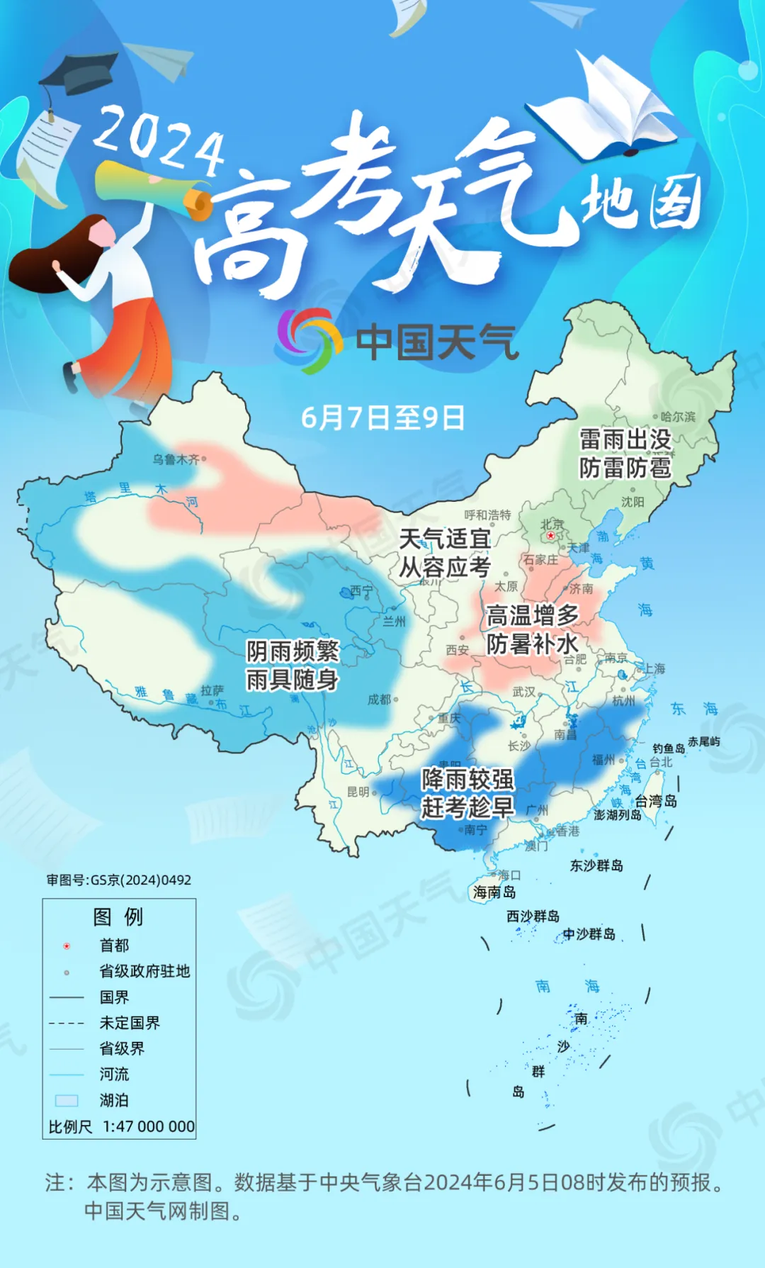 同時(shí),西藏、四川東部、甘肅西部、青海、新疆西部和南部等地高考期間也會(huì)有陰雨打擾,主要以小雨為主,考生及家長(zhǎng)需注意攜帶雨具,提前出門,注意交通安全。