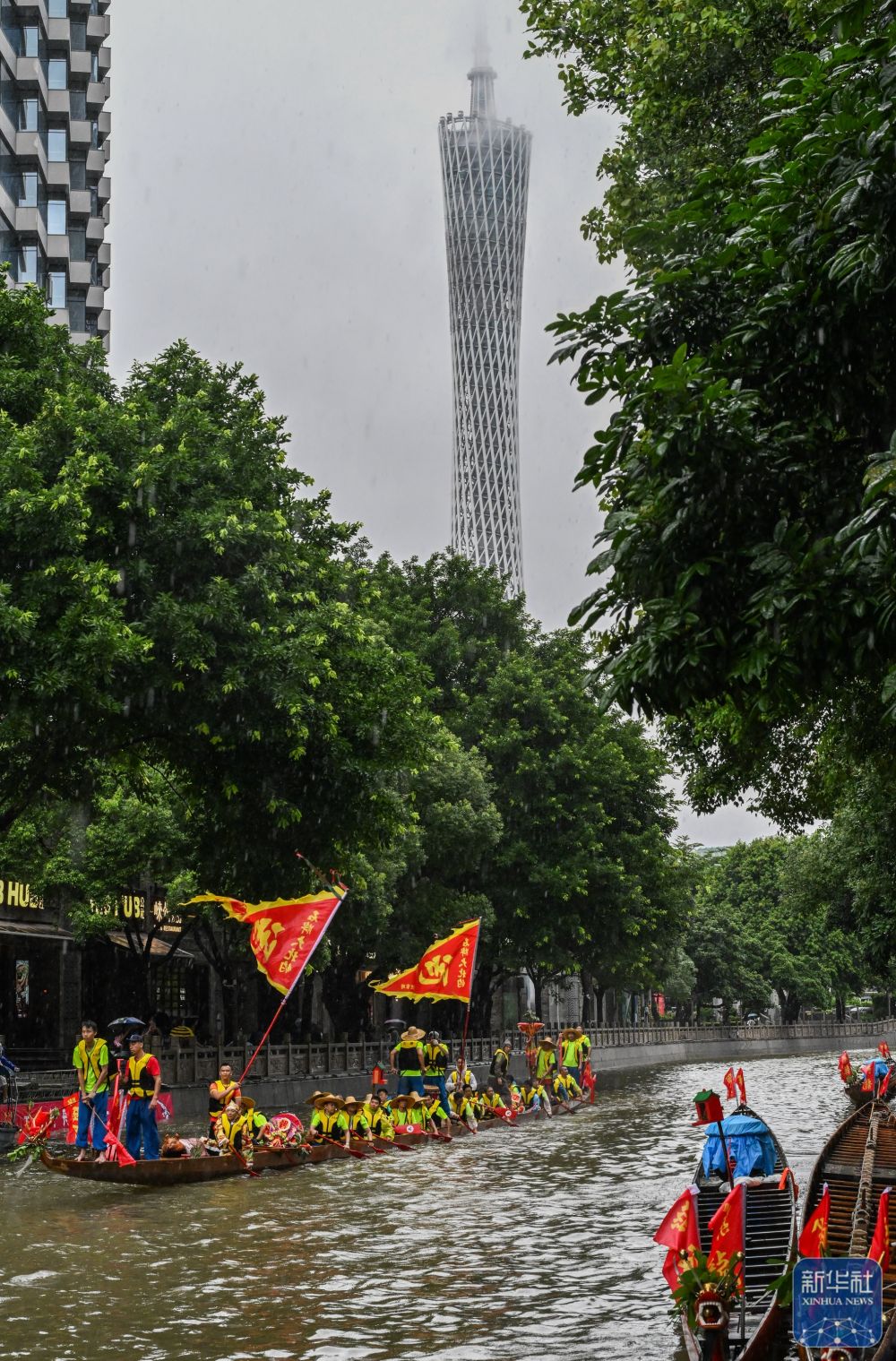 6月10日,獵德村熱鬧的傳統(tǒng)龍舟“龍船景”與繁忙的現(xiàn)代都市交匯相融(無人機(jī)照片)。“龍船景”是廣府地區(qū)水鄉(xiāng)在端午期間舉辦的一種民俗活動(dòng)。新華社記者 劉大偉 攝