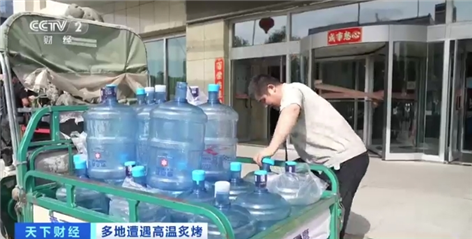 高溫天氣下,出行的人們打起了遮陽傘、戴上了遮陽帽。 受高溫天氣影響,人們對飲用水的需求也增加不少,在烏魯木齊市的一處樓宇,送水工人比平時(shí)忙碌很多。
