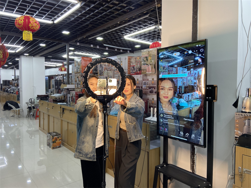 “市面上的五金產(chǎn)品,在我直播間都可以買到,都是‘中國(guó)制造’?!敝鞑グ⒁栏駸崮尽す葎e克正在用俄語(yǔ)、哈薩克語(yǔ)等多種語(yǔ)言進(jìn)行跨境直播帶貨。