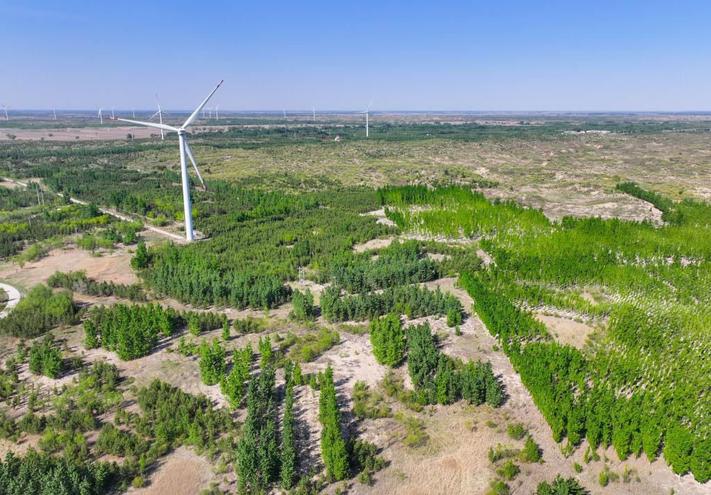 這是在內蒙古通遼市科爾沁沙地“雙百萬畝”綜合治理工程努古斯臺項目區(qū)拍攝的風力發(fā)電機組(2024年5月15日攝,無人機照片)。新華社記者 連振 攝