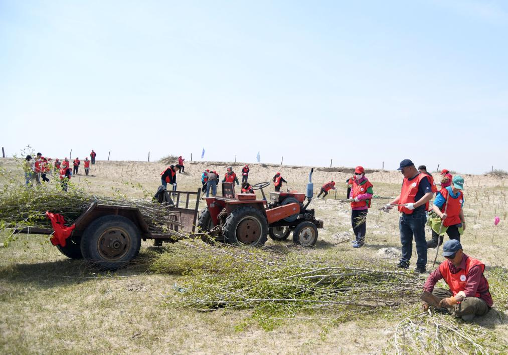 2024年5月6日,在地處渾善達克沙地的內蒙古錫林郭勒盟正藍旗寶紹岱蘇木扎魯特嘎查,志愿者們開展植綠活動。新華社發(fā)(巴依斯古楞 攝)