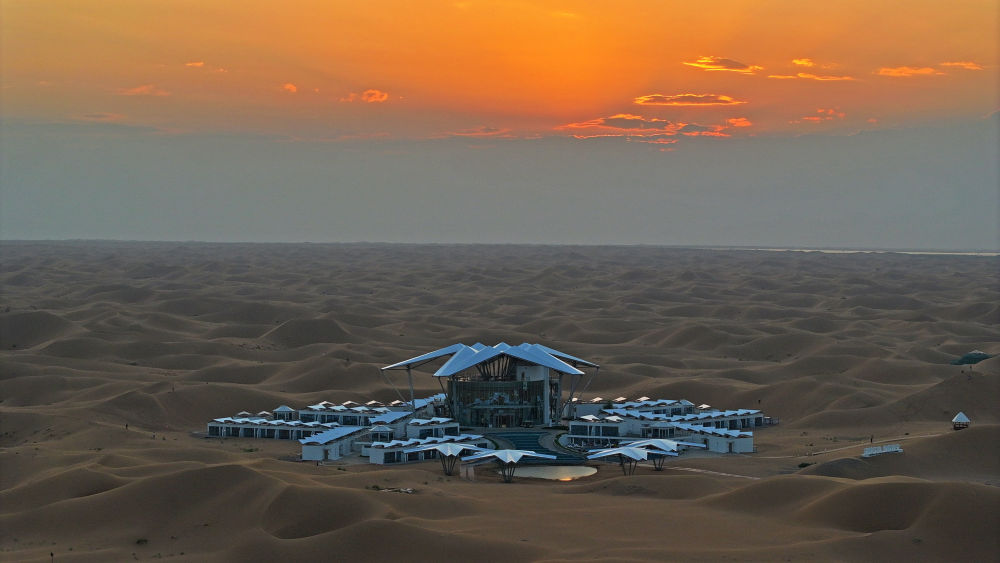 這是位于寧夏中衛(wèi)市沙坡頭景區(qū)的星星酒店(2023年9月6日攝,無(wú)人機(jī)照片)。新華社記者 王鵬 攝